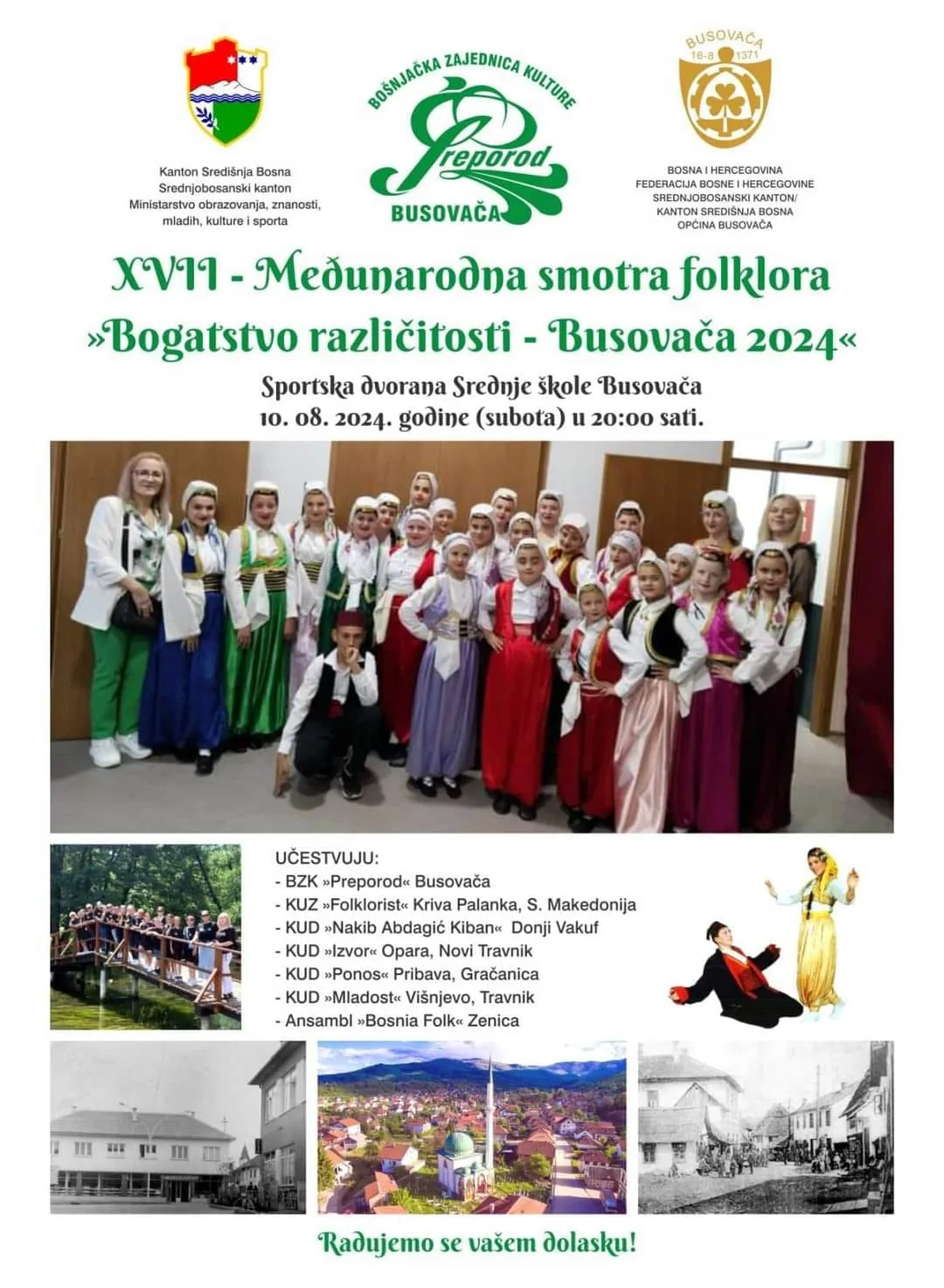 Busovača će večeras biti domaćin 17. Međunarodne smotre folklora pod nazivom “Bogatstvo različitosti – Busovača 2024.” Ova kulturna manifestacija, koja će se održati u sportskoj dvorani Srednje škole Busovača s početkom u 20:00 sati, okuplja folklorne ansamble iz različitih krajeva i pruža priliku za prikazivanje bogatstva i raznolikosti tradicionalnih plesova i nošnji.