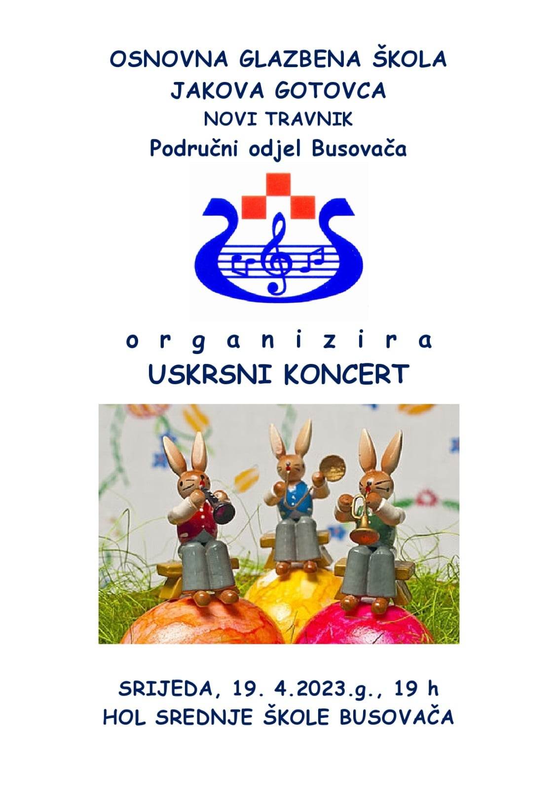 Područni odjel Osnovne glazbene škole Jakova Gotovca u Busovači večeras organizira prigodni “Uskrsni koncert”. Početak je 19 sati, a lokacije je dobro poznata – hol Srednje škole “Busovača”.