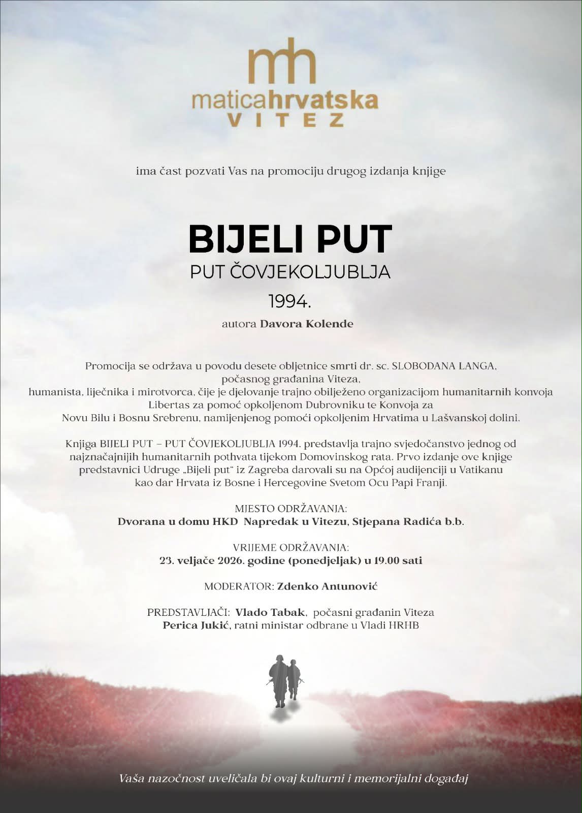 Povodom 10. godišnjice smrti dr. Slobodana Langa, humanitarca i jednog od organizatora humanitarnog konvoja „Bijeli put za Novu Bilu“ koji je u prosincu ratne 1993. godine vratio nadu Hrvatima okupirane Lašvanske dolinu da nisu sami ni zaboravljeni, u Vitezu čiji je dr. Lang počasni građanin, večeras će biti predstavljena knjiga koja govori o Bijelom putu kao put čovjekoljublja. U pitanju je drugo izdanje spomenute publikacije.