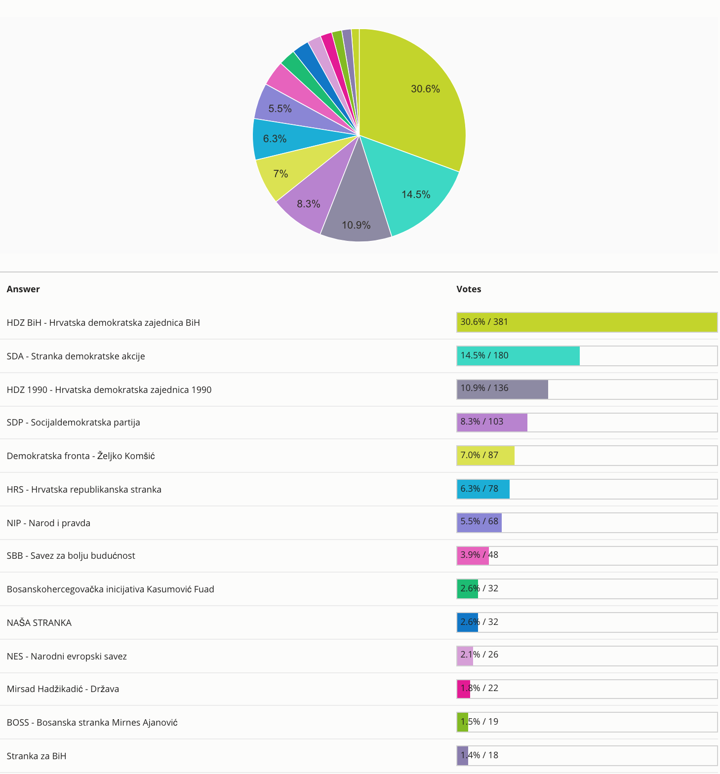 Paralelno, uz anketu za članove Predsjedništva BiH, na našem portalu aktivna je bila i anketa za glas političkoj stranci, a u anketu smo uključili skoro sve političke opcije koje su svoje liste predale za razinu Sabora/Skupštine Županije/Kantona Središnja Bosna.