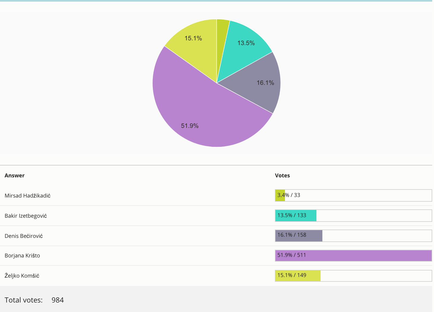 Za bošnjačkog člana Predsjedništva BiH situacija je malo kompliciranija. U tijesnoj utrci Busovljaci odnosno svi oni koji čitaju naš portal prednost su dali Denisu Bećiroviću iz SDP-a – ukupno 16,1% glasova i li ukupno 158 od 984 glasa. Drugi po broju glasova je lider SDA Bakir Izetbegović sa 133 glasa ili 13,5%. Najmanje glasova u našoj anketi dobio je Mirsad Hadžikadić – 33 glasa ili 3,4%.