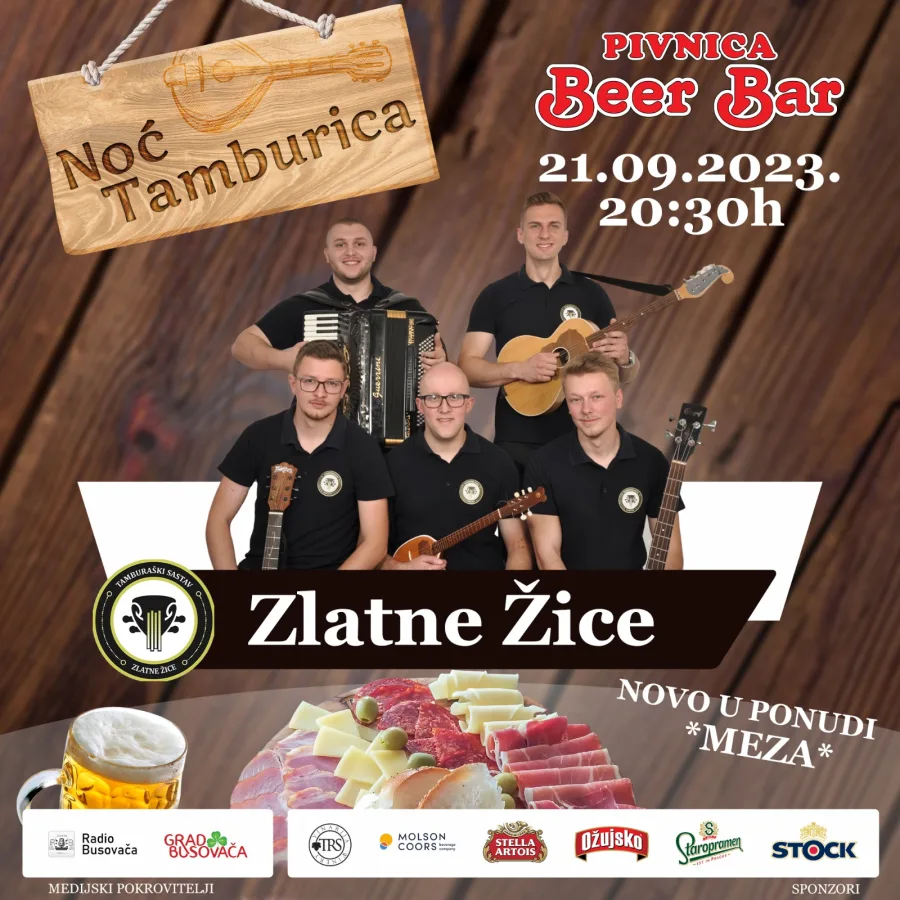Nakon uspješnog koncerta i nezaboravne kafanske večeri uz Busovački trio, pivnica Beer Bar Busovača sprema se za još jedan glazbeni spektakl. Ovoga puta, u četvrtak, 21. rujna 2023. godine, s početkom u 20:30 sati, domaćin će biti talentirani tamburaški sastav “Zlatne Žice”.